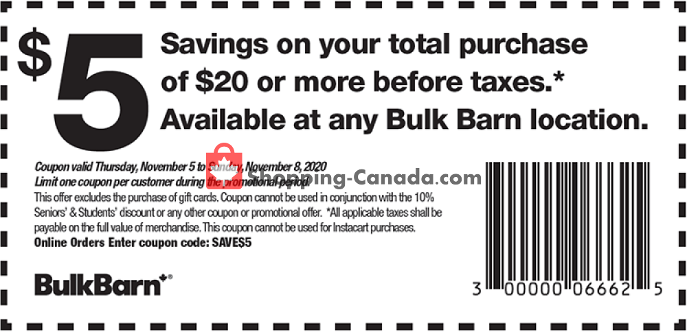 Bulk Barn Canada Coupons Valid until June 22 A Bulk Barn coupon, deal, promo code, offer and flyer for July 2022. Search by Brand . Download App. Apple App Store Google ... Bulk Barn Canada Coupons Valid until June 22. June 15th 2022. This Bulk Barn flyer has 246 views. 1; View more Bulk Barn Deals. View more Bulk Barn Deals. SERVICES. Home; iOS App; Android App; SOCIAL. Instagram ... New Bulk Barn Coupon I Canada I May I 2022 - Canadian Deals Save up to $7 with Bulk Barn! Save $5.00 off when you spend $20.00 or more. The above coupon gives you a savings of $5.00 when you spend $20.00 before taxes. (Scroll down the page to see the coupon) Limit one coupon per customer. This offer excludes the purchase of gift cards. For online orders, enter the coupon code: SAVE$5