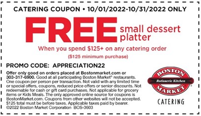 Free Dessert Platter | Boston Market Select Order Type. Order Pickup. Choose at the counter or curbside. Order Delivery. Your order comes to your door. Order Catering. Feed the group at your event.